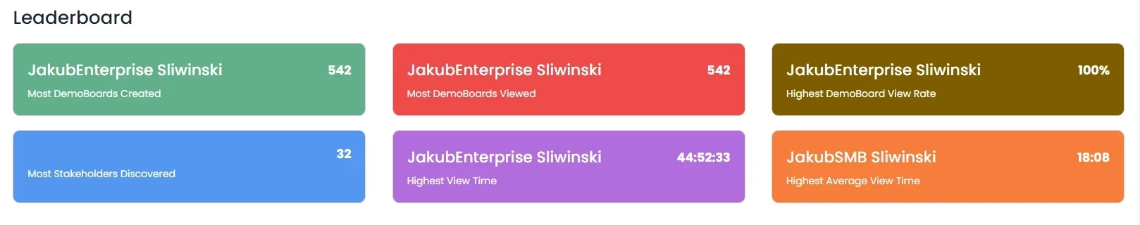 The leaderboard will show the leaders in each of the categories for the DemoBoards they have sent out. For example, in this picture we can see that for DemoBoards Garrett has sent out, his have been viewed the most. Or on the DemoBoards sent out by Jami, her prospects are viewing the demos for the highest average amount of time.