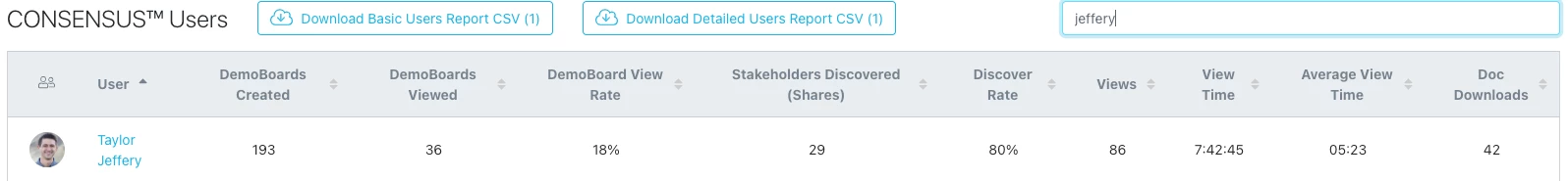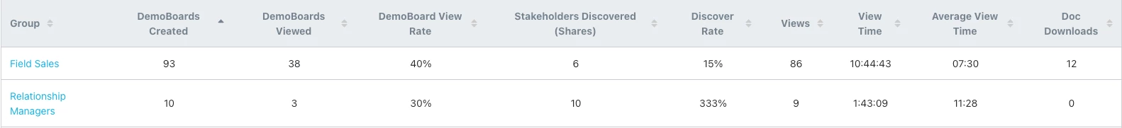 2. Below this you will see this breakdown for each team within Consensus. If you have two teams in similar roles you can see how they stack up against each other. Like the main graph you will be able to see demos sent, views, view rate, stakeholders discovered (a very important piece of data that you will want to focus on), Discovery Rate, and Doc Downloads.