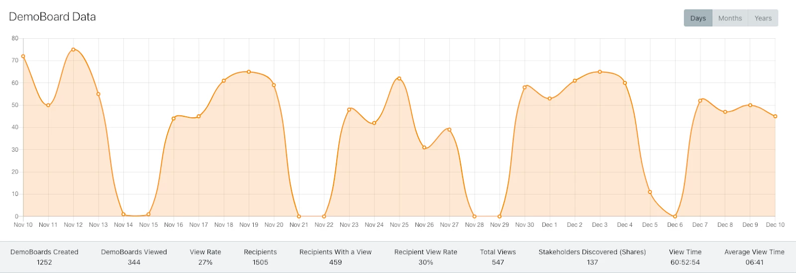 Before we dive in there are some data points you need to understand, besides DemoBoards created, DemBoards viewed, recipients are the number of people added to all of those DemoBoards. You have the view rate is the percent of DemoBoards sent, that have a view. You will want to make sure you understand what a stakeholder is. This is where a prospect has been sent a DemoBoard and they have forwarded it onto someone else. You will now have the information for this new stakeholder and their viewing info for the demo itself. Particularly early in the sales cycle, you should always encourage prospects to share the demo with others, you never know who you will discover. The discovery rate is the percentage of DemoBoard views that came from new stakeholders. Last is the Doc Downloads, this is for demos where you have attached any documents and just a general idea of how many times those documents were clicked on and downloaded.