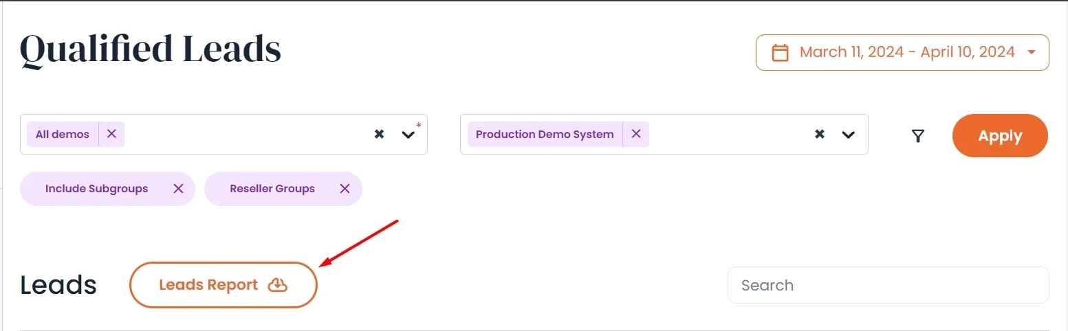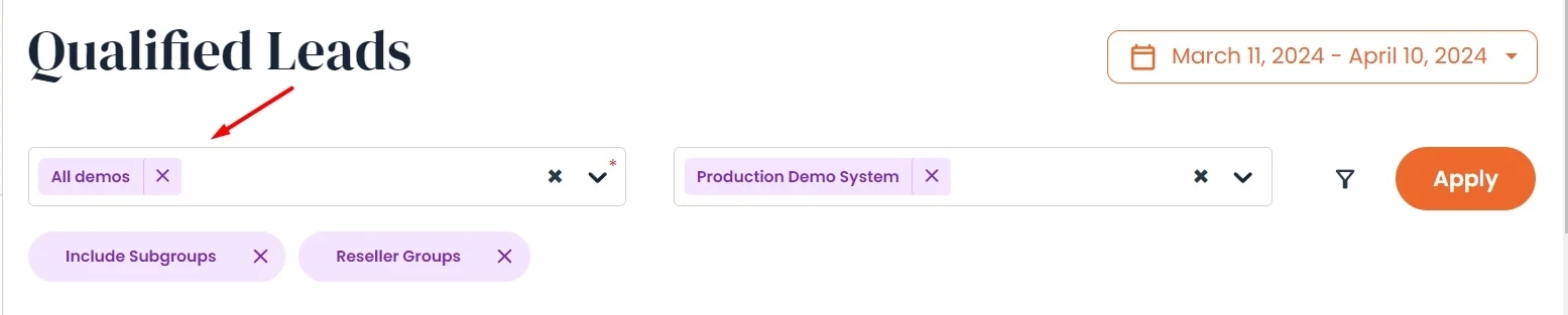 The system will default to "All Demos", however, you can choose specific demos to categorize the leads by within the search bar: