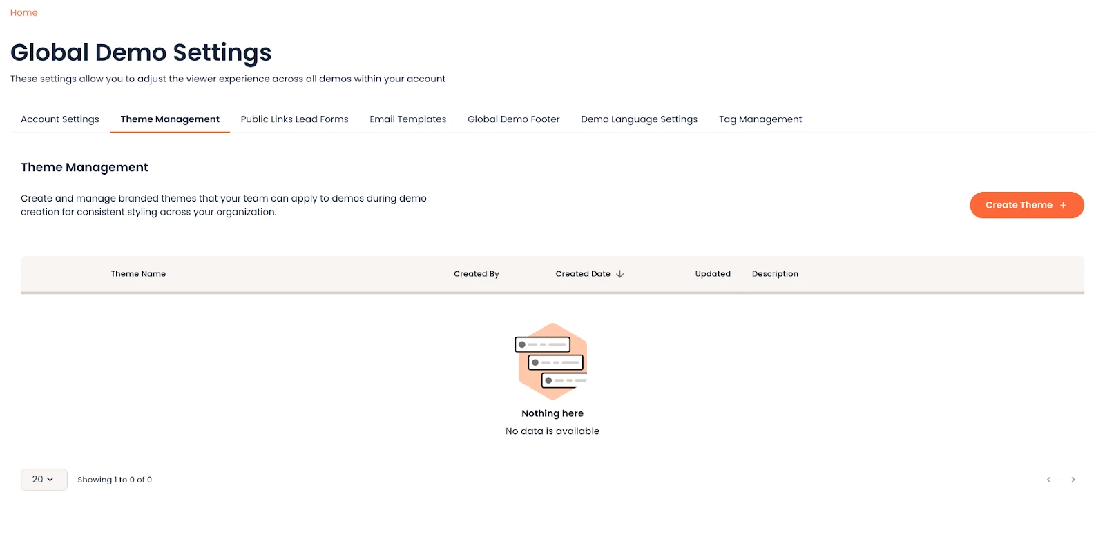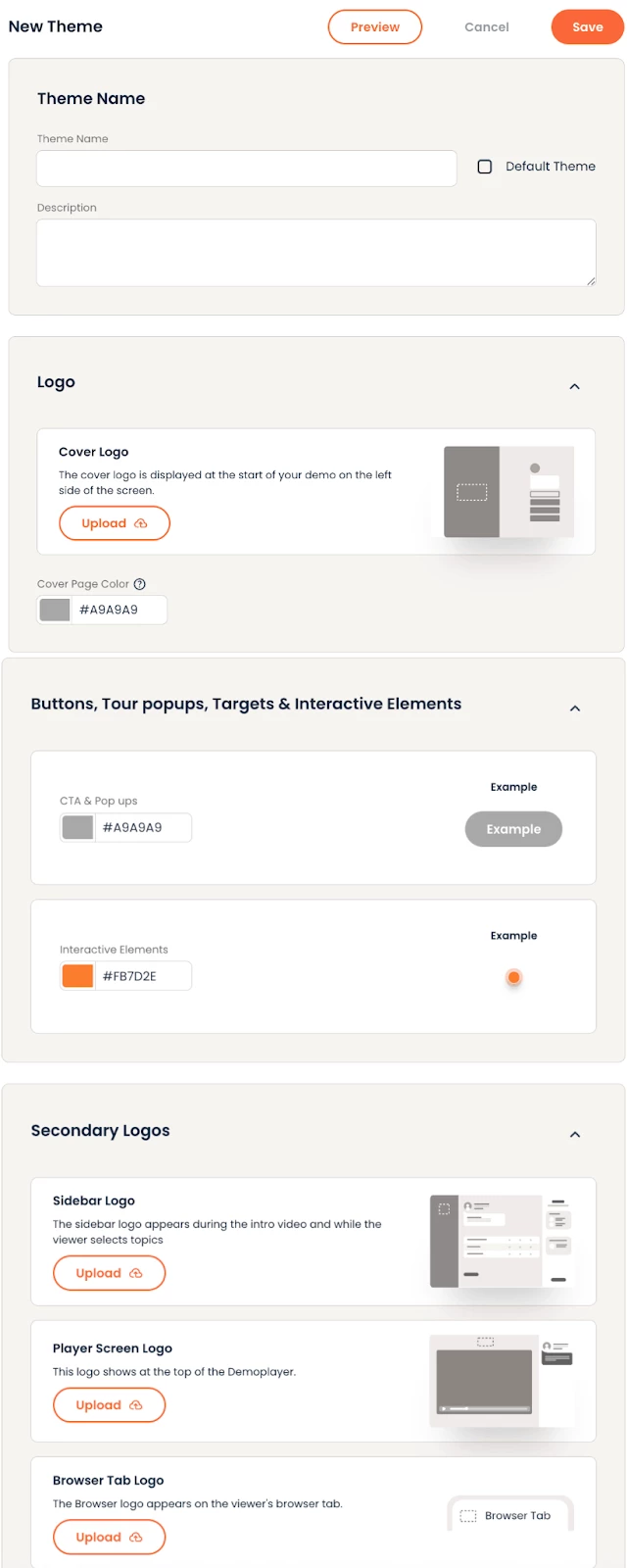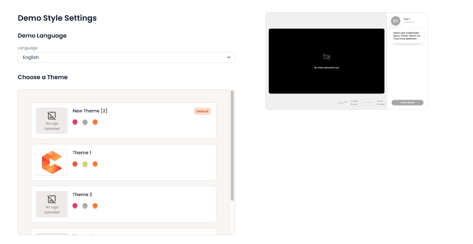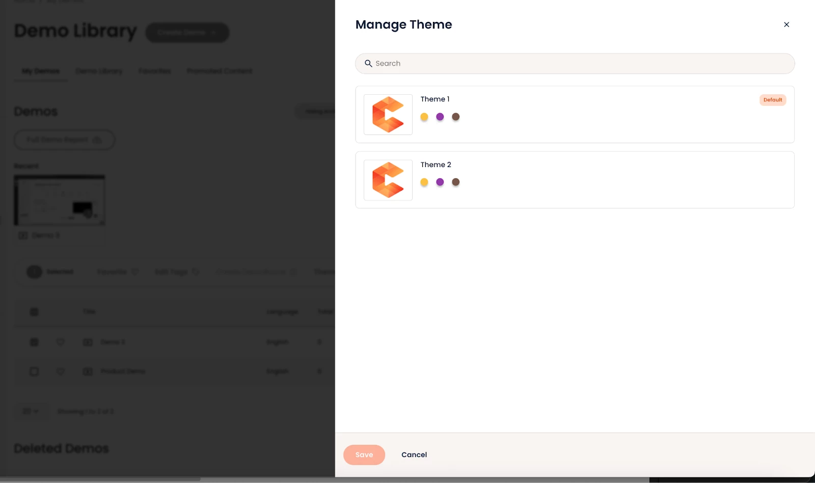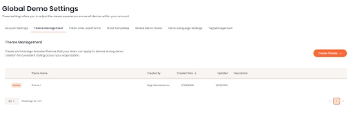 To ensure a consistent branded experience for your audience, create at least one theme before editing demos. This allows you to immediately start using the new capability instead of granually applying branding settings to the demos shared with you.