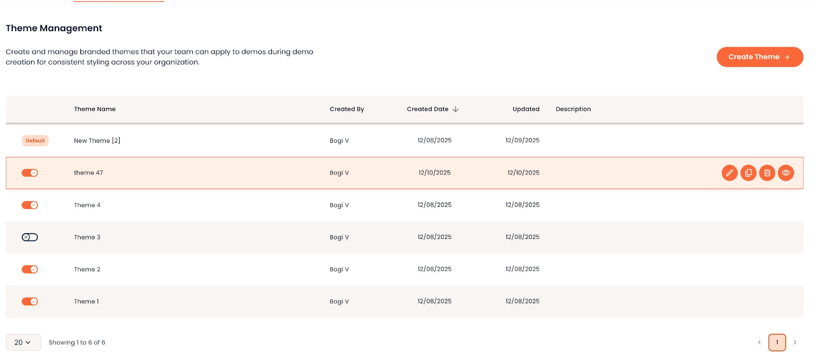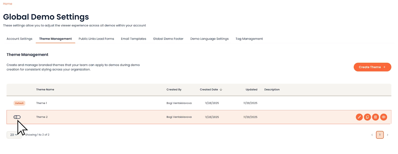 Your first theme is always going to be the Default theme for your organization and it’s always active. This is the theme which your presales and sales peers use most frequently for their demos. An organization can have multiple themes, but only 1 default theme and it cannot be deleted and or deactivated.