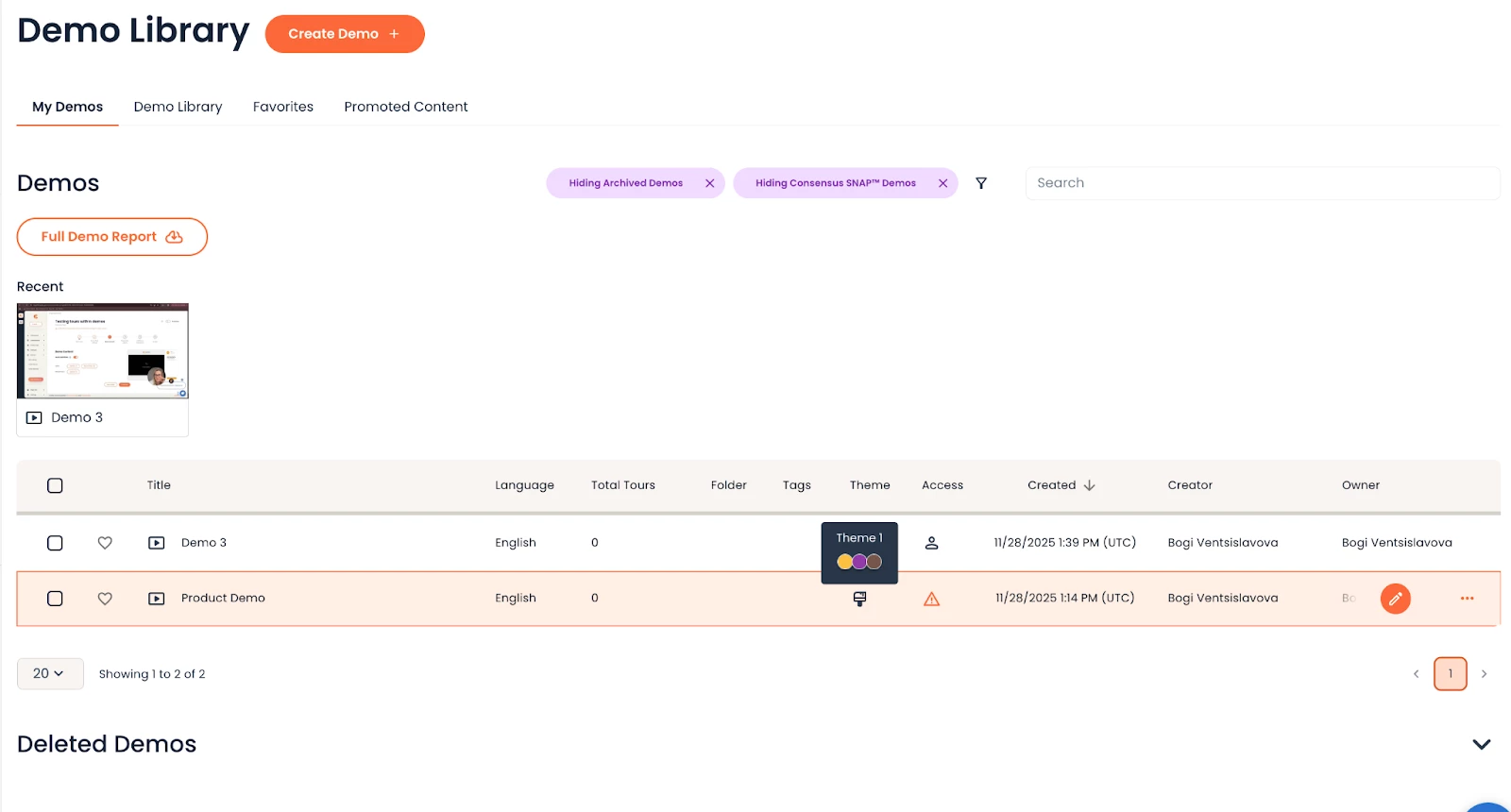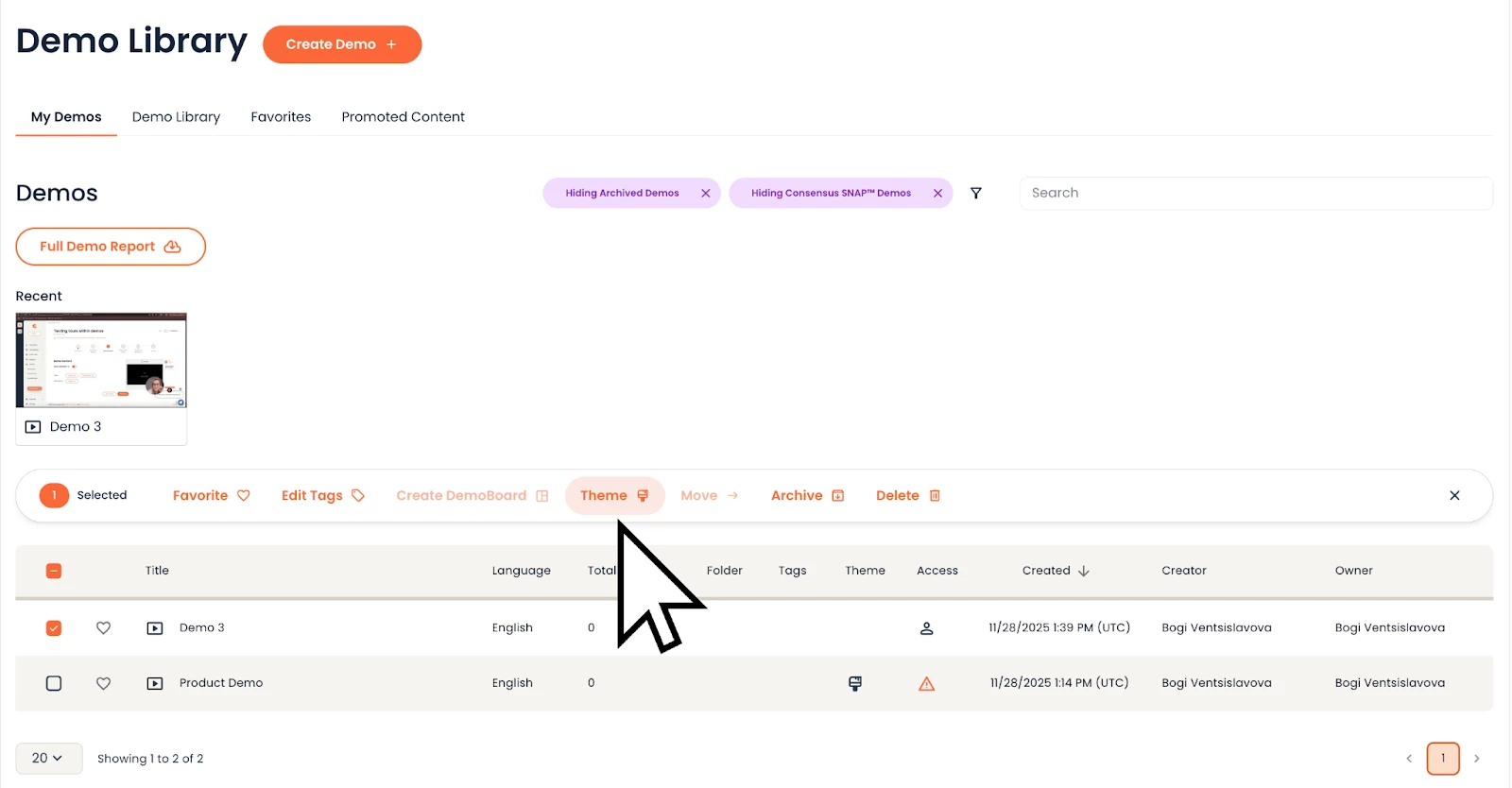 In the Demo Library tab we’ve included an additional column called ‘Theme’. A paintbrush icon will show to every demo that has been branded using Themes instead of the legacy branding styles.