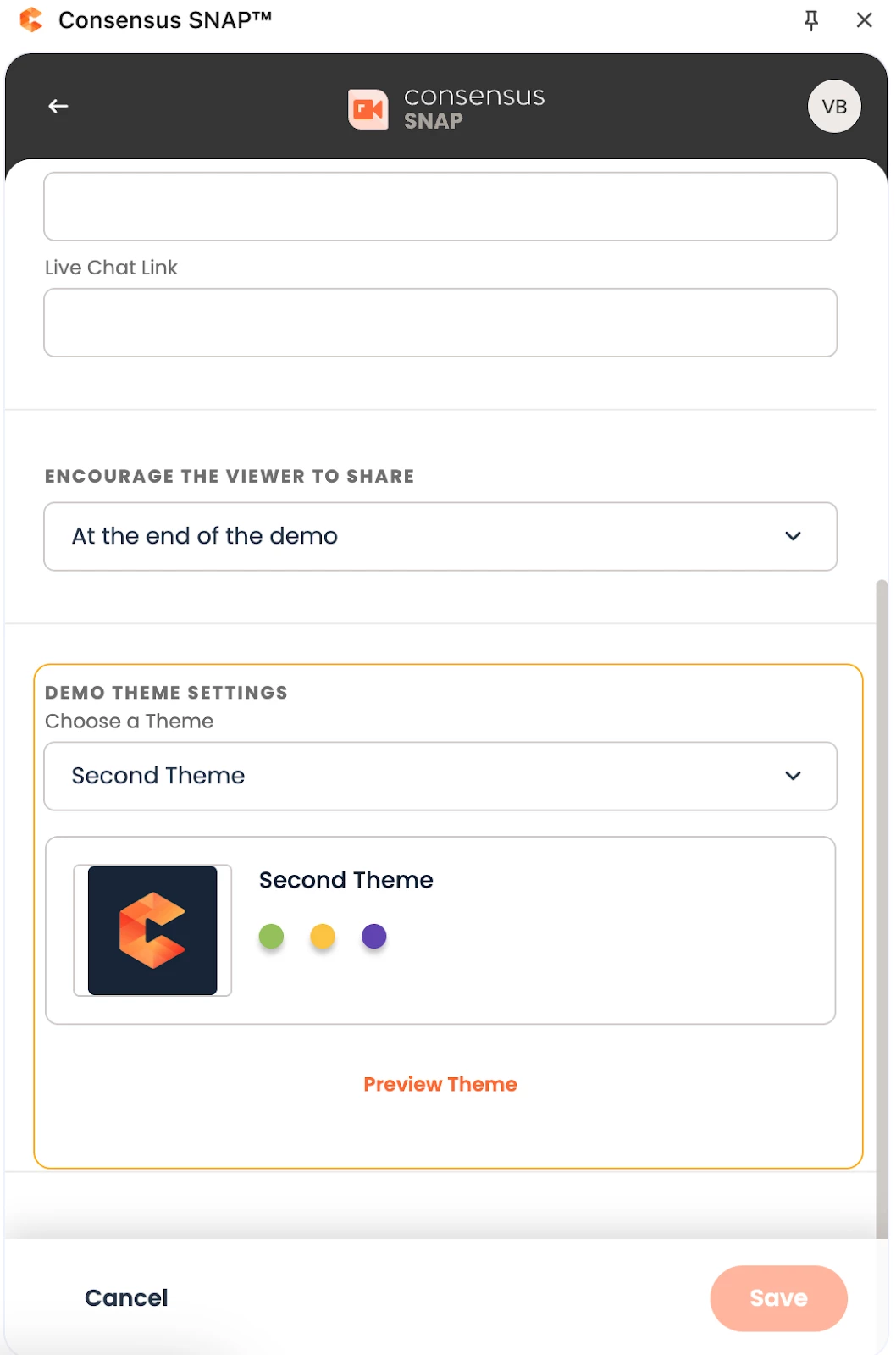 You'll see a quick preview of your selected theme right in the settings. Want to see more details or make changes? Click Preview Theme to open the full theme editor in your Consensus workspace (note: only admins can edit themes).