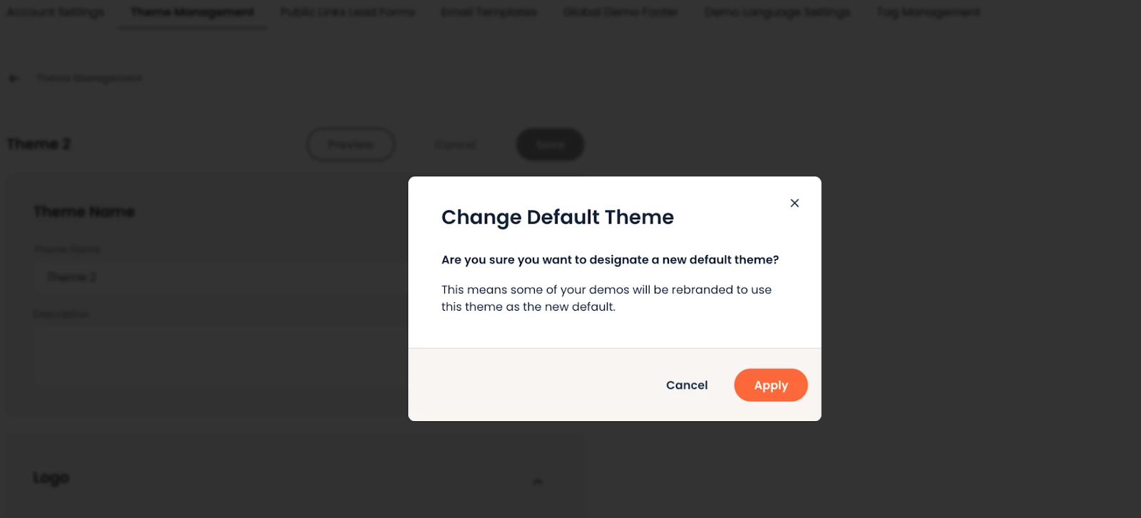 Important: Once a user selects to apply a theme, that demo permanently switches to the new themes setting. They cannot switch back to legacy branding.
