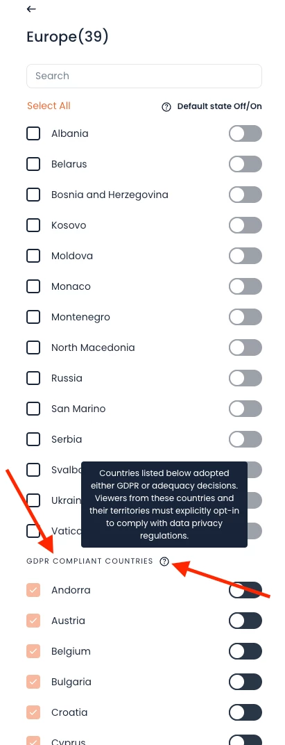 In addition to the pre-selected countries, you can also decide which other countries need to have this option and select the default state of the opt-in toggle by following the instructions below: