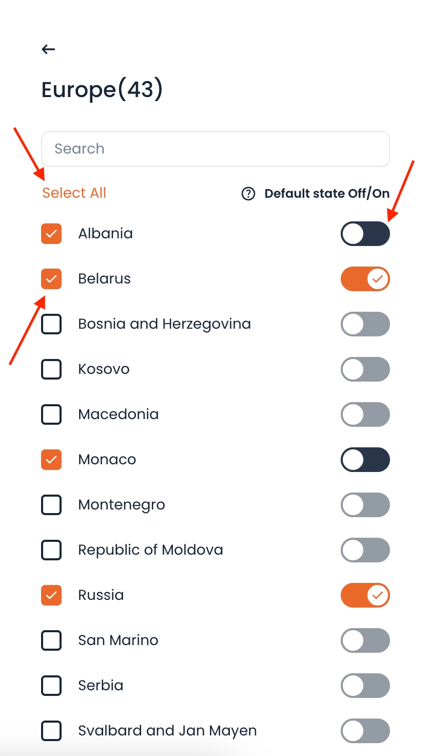 - Select the country or countries for which you would like to turn Opt-In to ON. Or, you can click ‘Select All,’ and all listed countries will be turned on.