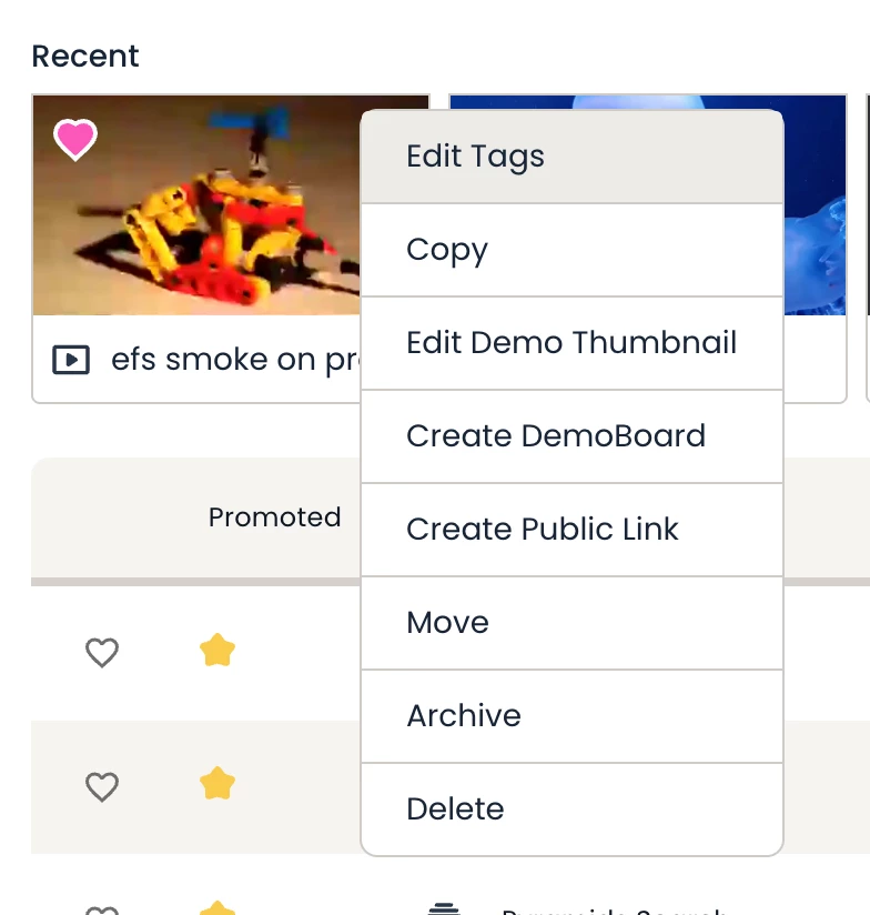 - You can also assign tags if you select the ‘...’ menu on the Demo Library page → Recent Demos Thumbnails.