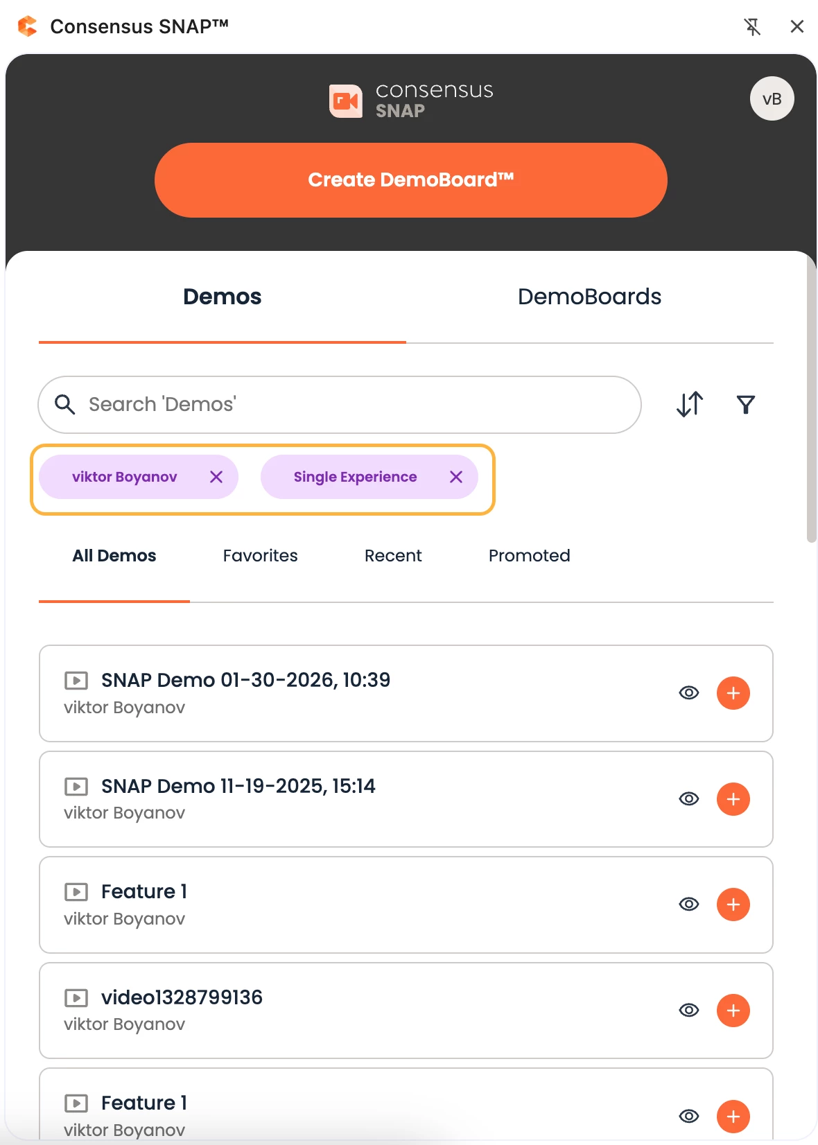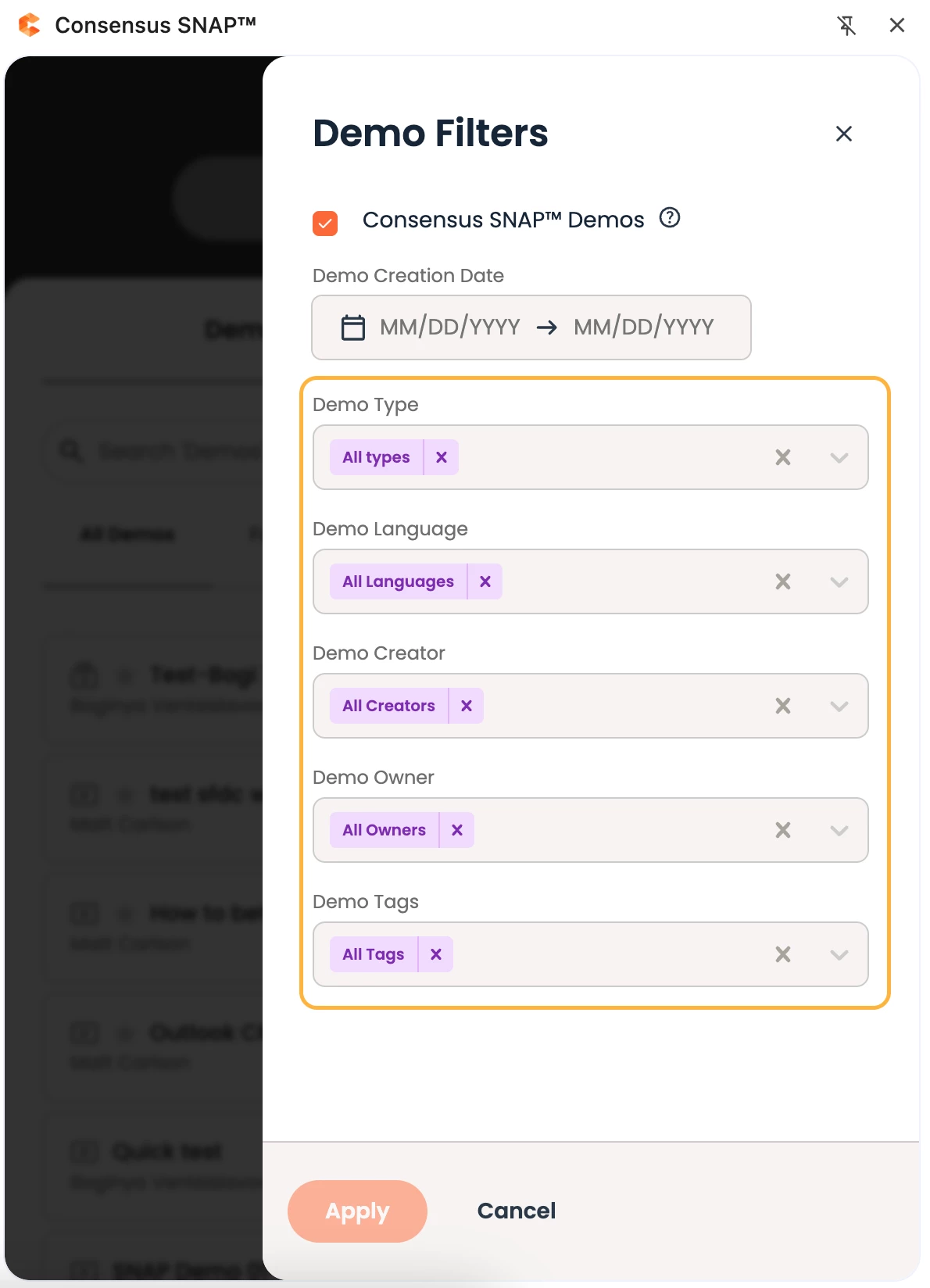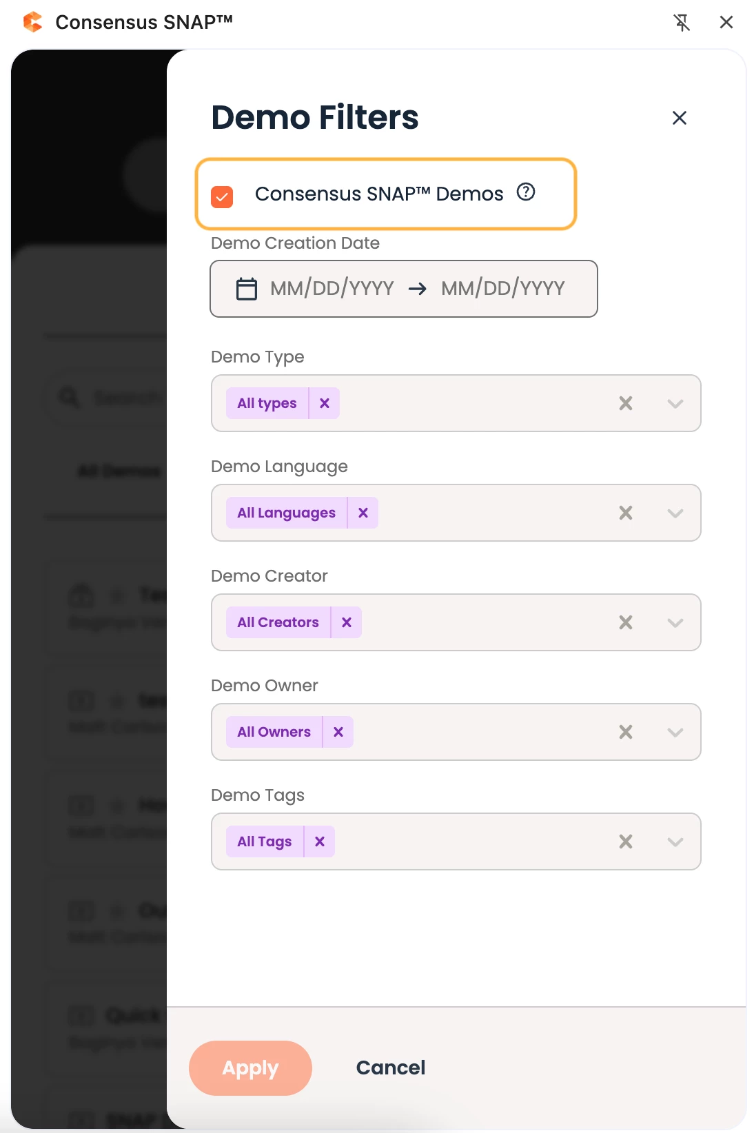 1. Consensus SNAP™ Demos → filters demo search results by only demos created within Snap