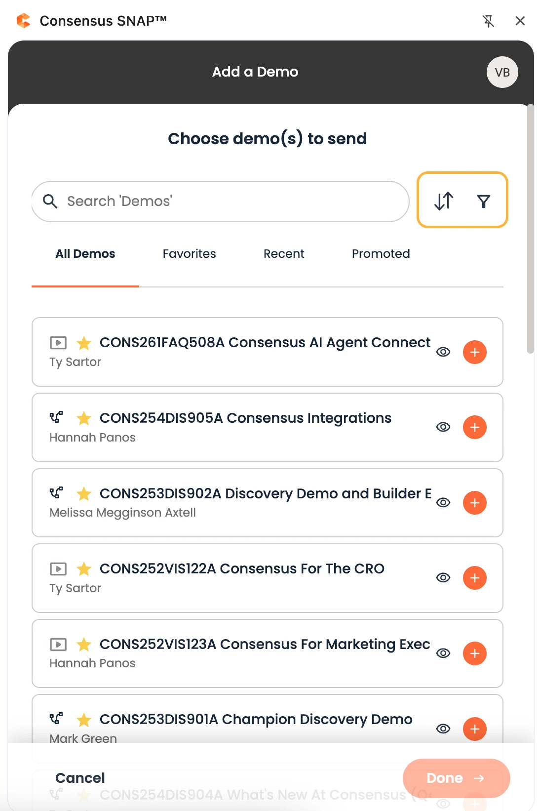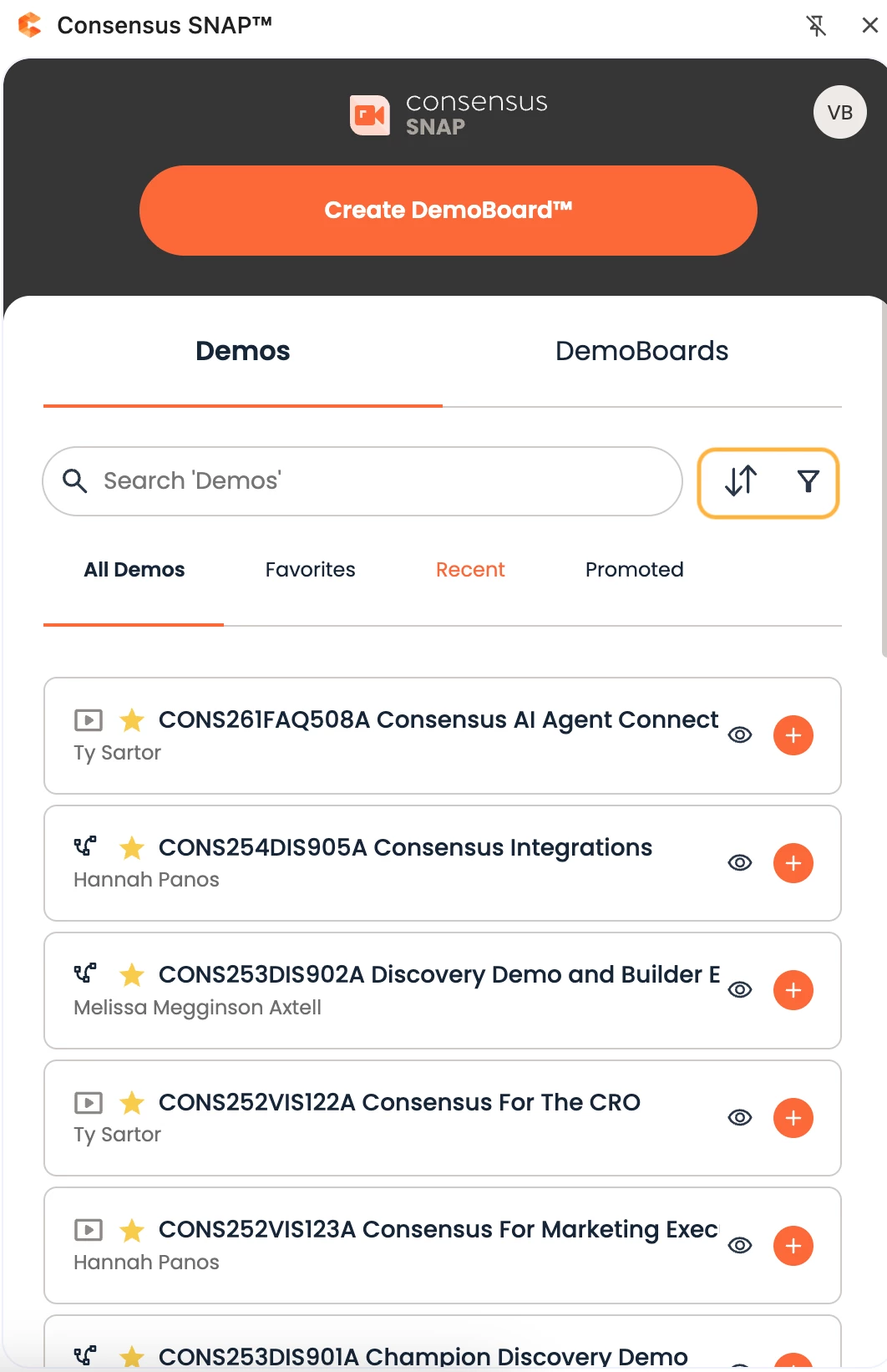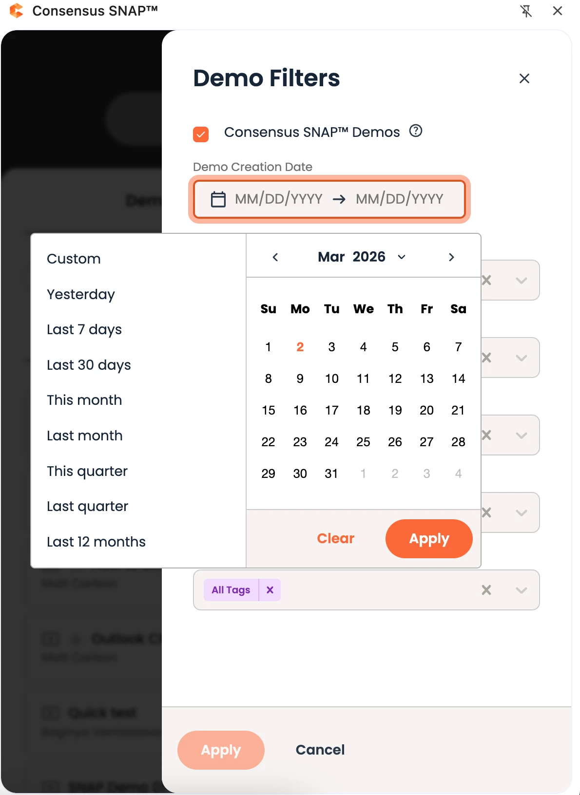 1. Consensus SNAP™ Demos → filters demo search results by only demos created within Snap