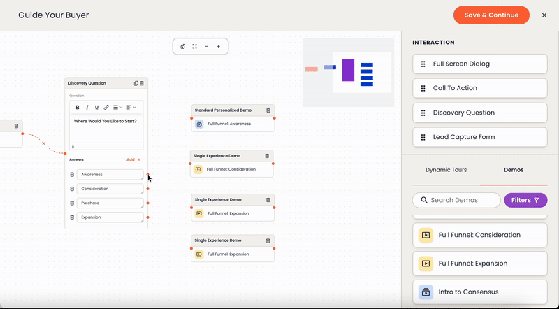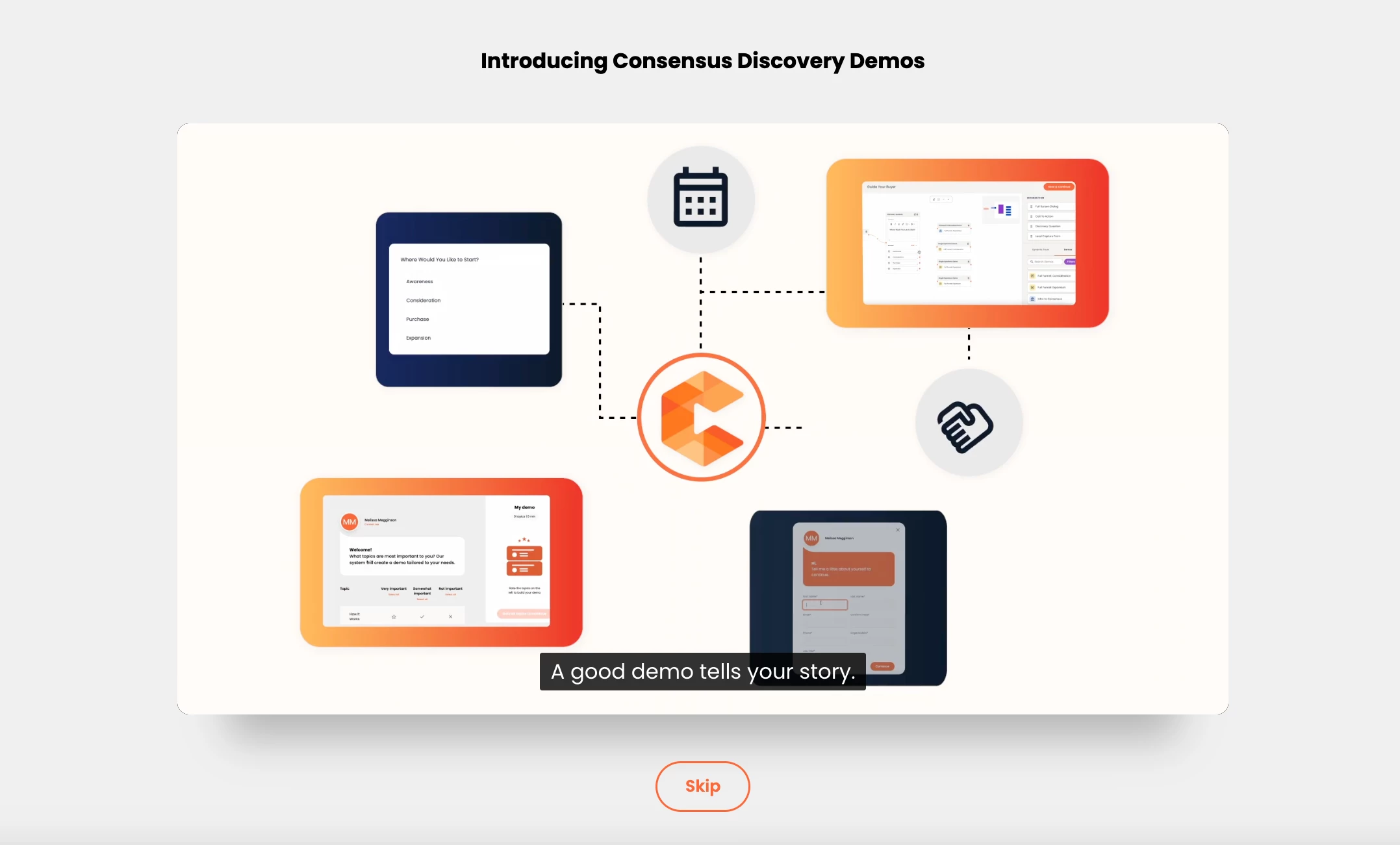 The rules of B2B buying have changed: Buyers do not want to meet with you... until they are ready. Now, your Consensus platform is a unified tool that powers the buyer’s journey before they’re ready to meet and after they’re ready to meet—from self-serve product experiences to high-impact live demos, Discovery Builder helps you win more deals, faster.