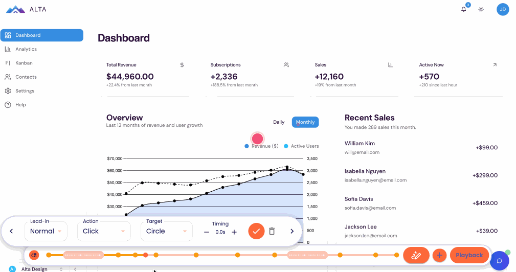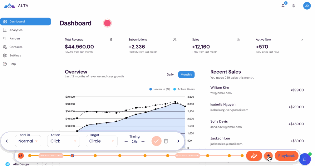 When you are using the Dynamic Tour editor, we have added a new + button. This allows you to add a click along the timeline of your Dynamic Tour. This is really helpful if you forgot to include a click on something you wanted to mention in the tour or you can add in clever additional clicks to help you create some demo magic to speed up transitions, load screens, processing times, etc.