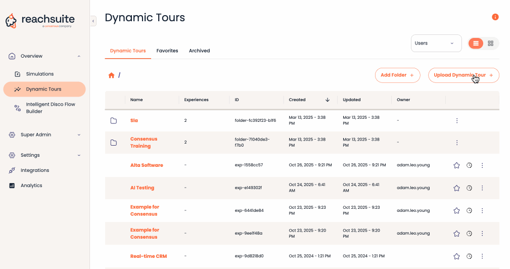 You are now able to click Upload Dynamic Tour on the Dynamic Tour management screen to upload a video tour. This can be a previously created video, a video tour you created for a native app, a video tour on a mobile emulator, a video tour using 3rd party extensions, etc.