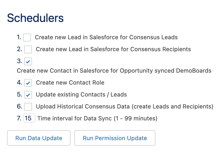 Scheduler 5: Updates existing Contacts/Leads (does not make any new Contacts/Leads from Consensus; only searches by email address to update existing Contacts/Leads DemoBoard analytics). This is the most commonly used Scheduler and usually the minimum necessary Scheduler to get data from Consensus > SFDC.