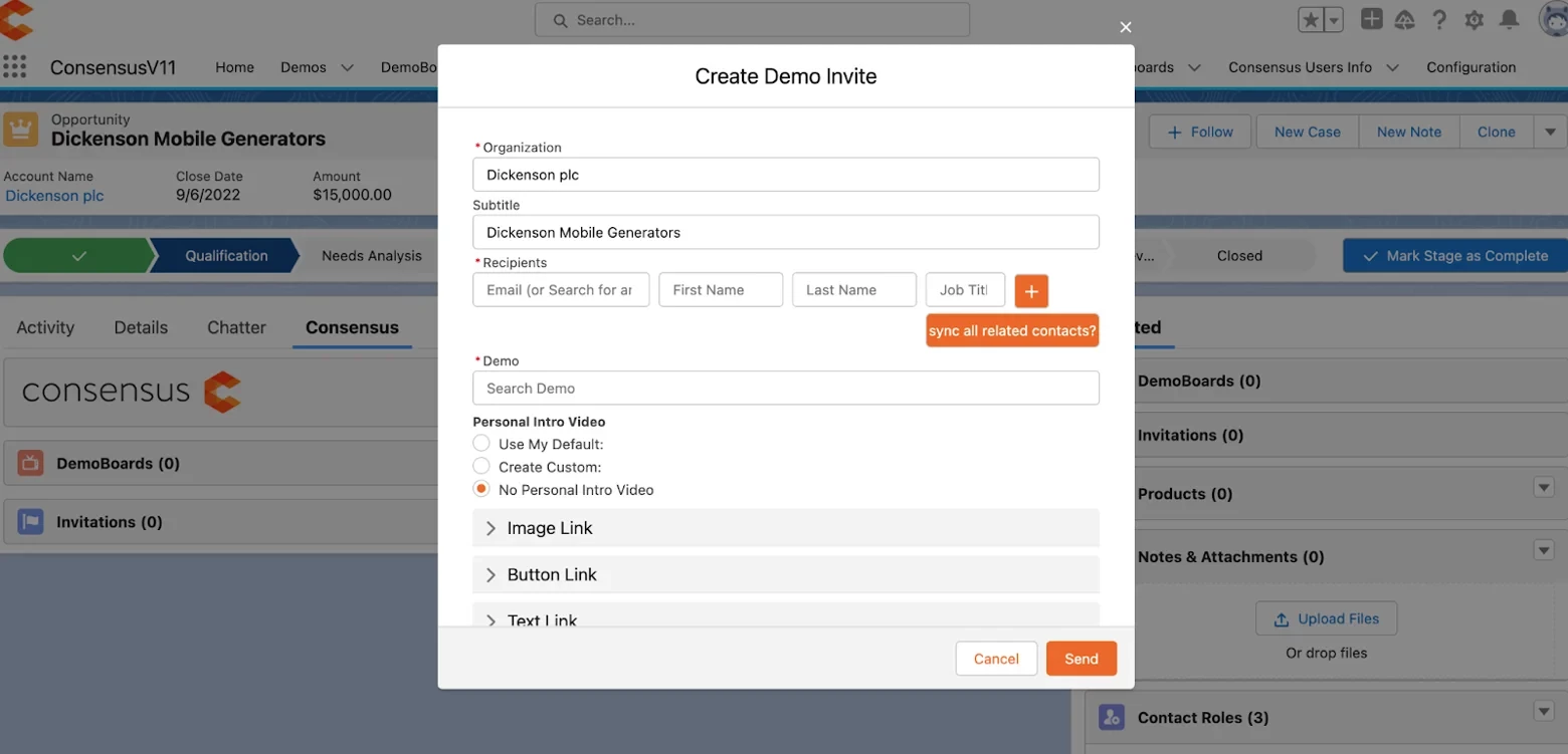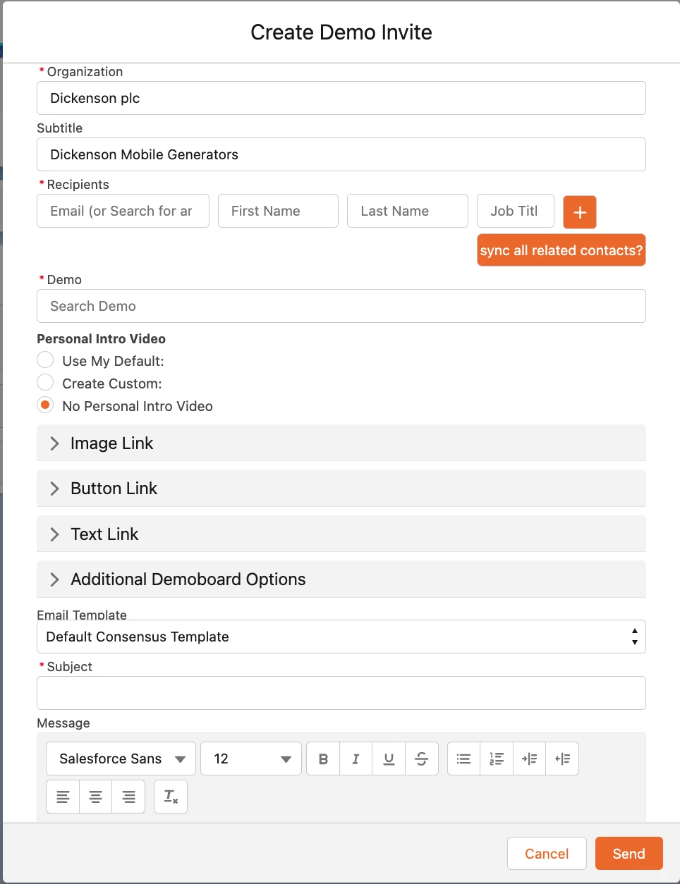 You can create a DemoBoard (Demo invite) for any Lead, Account, Contact or Opportunity within the Consensus Salesforce App Component.
