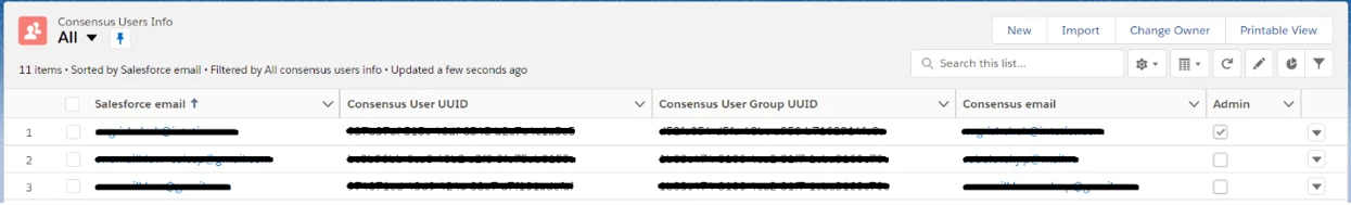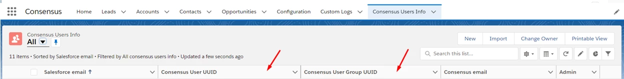 ‘Consensus User UUID’ and ‘Consensus User Group UUID’ are filled automatically when the user logs into the Consensus app in SFDC.