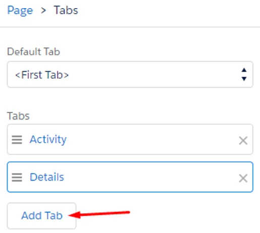 To add the Consensus Salesforce App component, we suggest adding a new custom labeled’ tab called “Consensus” in the section ‘Page >Tabs’. Select the section ‘Page >Tabs’ and click Add Tab in the right section