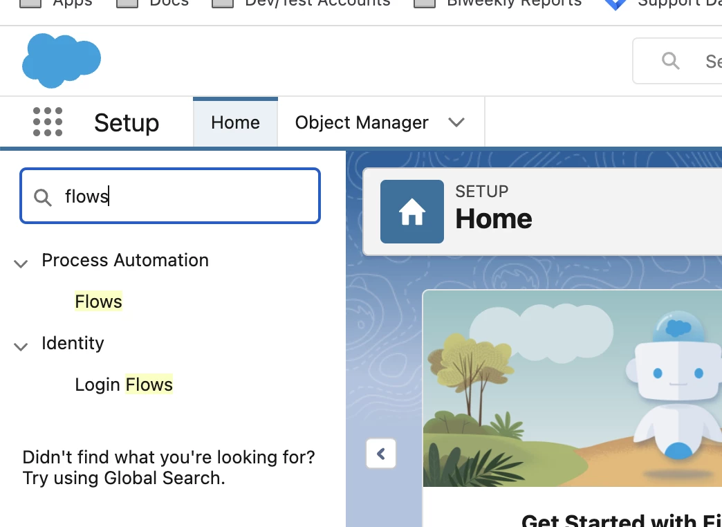 Go to Setup > and search for "Flows" inside of the left sidebar menu. Select "Flows" under the Process Automation section.