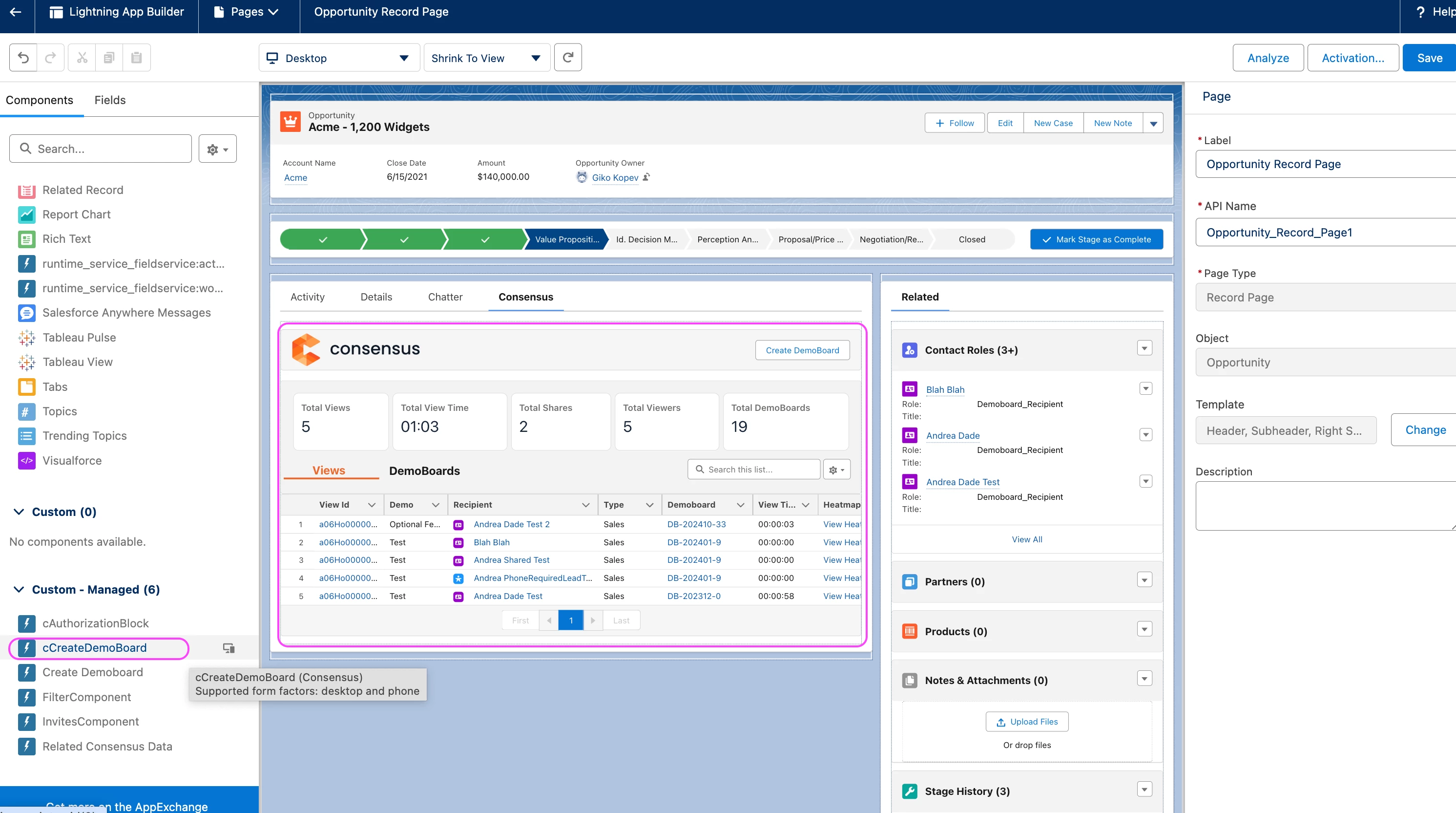 The Consensus Salesforce App package includes a custom component that allows your Consensus users to properly authenticate with our web application, create DemoBoards, and send those DemoBoards with email templates.