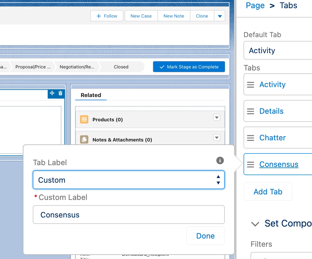 Click on the newly added tab and choose ‘Custom’ from dropdown. Print ‘Consensus’ to the ‘Custom Label’ input field and click Done