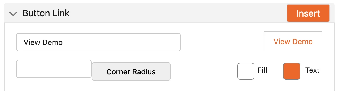 You can manage the Button link name, button corner radius, color of the button and color of the text. When you finished all button customization press ‘Insert’ and the button will be added to the message body.