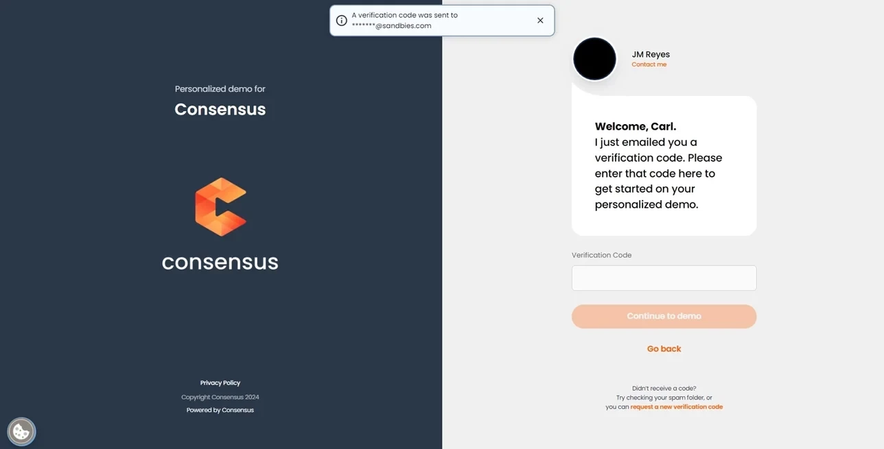 *If a viewer is not on the DemoBoard, selecting "New Viewer" will prompt them to enter their name and email address. If their email matches the original recipient's domain or belongs to the same org, they will receive a 6-digit verification code via email.