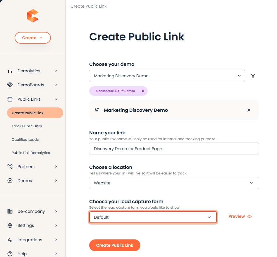 That’s it! Leads that are generated by your Consensus demos will show within the Track Public Link and Qualified Leads area. Check out our resources on integrating with your Marketing Automation Tool to send the lead and engagement data directly to your MAT.